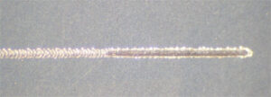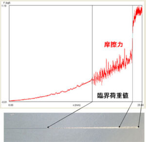 膜の付着性を評価するスクラッチ試験機を用いダイヤモンドライクカーボン(DLC)膜の付着強度を測定した評価例と測定傷の観察写真を紹介いたします。