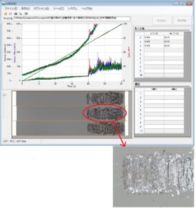 MMA基材上のハードコートを加温環境下でスクラッチ試験をした結果と顕微鏡写真