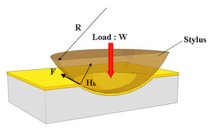 超薄膜スクラッチ試験機で採用しているマイクロスクラッチ試験法はスクラッチ試験法の測定原理をさらに高感度化し、ナノレベルの膜厚の膜に対応した試験方法です。従来のスクラッチ試験法では一定の曲率半径を持つ硬い(ダイヤモンド)圧子を薄膜表面に押付け(Fig.1)、荷重を増加させながら引っ掻き、薄膜のはく離が生じる荷重値(臨界はく離荷重値)を求める。