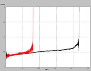 ジュースやビールは、輸送中や自動販売機の中等でダンボールや缶同士でこすられることにより、塗料がはげてしまう(傷つく)ことがあります。本測定では塗料や表面処理による塗料の耐摩耗特性を評価しております。摩擦係数が急激に変化した点で塗料がはがれ、基材のアルミが露出いたしました。赤と黒のグラフは用いた塗料が異なり、赤色のグラフの塗料は、1000回こすると傷が発生しました。これに対し黒色のグラフの塗料は2500回こすると傷が発生しました。これにより、黒色のグラフの塗料の方が摩耗に強いということがわかります。