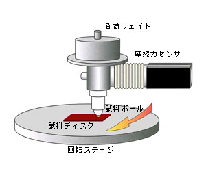 摩擦摩耗試験機では、一定の圧力を加えた状態で複数回の摺動を行うことで破壊を発生させます。例えば評価対象物を回転ステージ上に固定し、回転中心からずらした地点に一定荷重で試料ボールを押付けます。この状態でステージを回転させる事で、試料ボールと膜の間に生じる摩擦力により、試料ボールが回転方向に引っ張られる。この力を応力センサで検出し、印加した荷重値で割ることで摩擦係数を算出致しますす。本方式では、雰囲気・温度・湿度・相手材・荷重・速度等を実際の使用環境に模擬することができます。特に破壊を伴う測定法では、破壊様式の解明が難しく、実際の環境下における実際と同様の破壊様式による評価は現実に即した測定法といえます。
