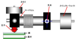 カウンターウェイトを調整し、圧子側の重量がゼロになった状態で、圧子の真上に印加したいだけのおもりをのせます。これにより、圧子を介して試料におもり分の荷重が印加されます。尚、摩擦摩耗試験においては、圧力も重要な要素となります。この為、単純な印加荷重だけではなく、圧子形状も想定して荷重を決めることとなります。ピンオンディスク(ボールオンディスク)摩擦試験機は、圧子の接触部形状に曲率を用いることがありますが、これはエッジ部による引っかかりを避ける為だけではなく、接触部の面積を極端に少なくすることで、測定時の圧力を高めることも理由の一つとなっております。