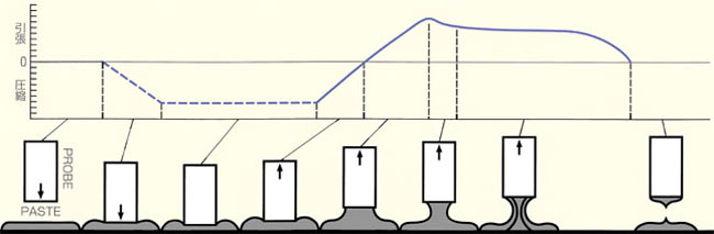 試料材をステージ上に設置し、上部よりプローブを指定された速度とコントロール方法(荷重制御及び侵入量制御)で試料粘着面へ接触させます。このときプローブの外周はプローブと一緒に試料へ接触したガイドで試料を固定します。設定された速度でプローブを試料から離脱させこのときプローブが粘着力により受ける抵抗を荷重値として、取得いたします。