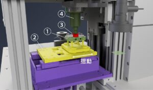 試料ディスクを固定したステージ①は、回転運動をカムを用いて直線駆動とした摺動ステージ②により摺動運動を行います。試料上部より圧子(球)③を試料ディスクに接触させながら摺動を行うことで発生する摩擦力を圧子が取付けてある荷重センサ④で計測しリアルタイムでPC上にグラフ表示します。圧子を試料ディスクに押し付ける荷重も同時に計測しリアルタイムでPC上にグラフ表示します。
