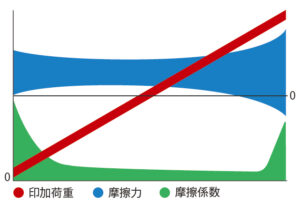 摺動駆動時の印加荷重をリニアに増加させながら摺動時の摩擦係数を計測いたします。焼き付きや潤滑切れによる摩擦係数の急激な増加を検出し、臨界荷重を評価いたします。摺動速度や摺動幅、及び荷重印加速度等を設定することが可能です。
